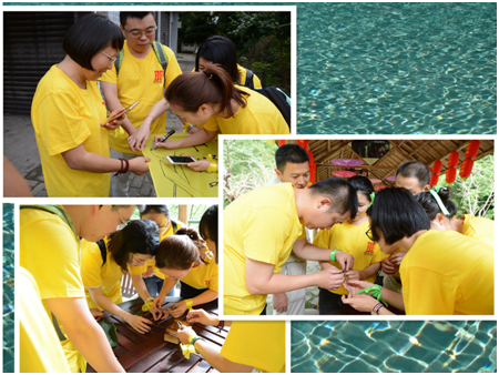 活動(dòng)的路線是穿越整個(gè)金刀峽景區(qū),各組根據(jù)任務(wù)書上的內(nèi)容,到達(dá)任務(wù)點(diǎn)后完成必選任務(wù)和備選任務(wù)。最后根據(jù)各組的用時(shí)決以勝負(fù)!各組成員以“合作”、“溝通”、“協(xié)作”為目標(biāo),運(yùn)用每個(gè)成員的細(xì)致觀察、積極思考,去尋找目標(biāo)、探索問題。隊(duì)員們精誠合作,每個(gè)人都盡最大努力去完成任務(wù)!雖說是三個(gè)組的PK賽,但PK過程中也不乏各組的雪中送炭、互幫互助。比如“擎天一柱”環(huán)節(jié),各組要將14根釘子從封閉的木箱子中取出,并在不借助其他物體的情況下將其中13根釘子立于1根釘子上。“刀鋒戰(zhàn)士”組在“開箱子”時(shí)屢試屢敗、一籌莫展時(shí),“穿山甲”組的隊(duì)員及時(shí)給予提示,幫助“刀鋒戰(zhàn)士”順利開箱,最后“刀鋒戰(zhàn)士”以614秒的成績(jī)問鼎該環(huán)節(jié)!
